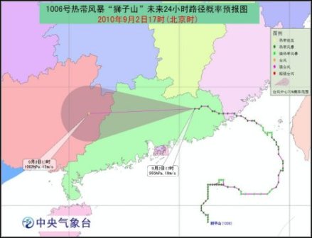 今年第6號熱帶風暴“獅子山”的中心于9月2日11時由福建省詔安縣移入廣東省饒平縣境內(nèi),17時“獅子山”位于廣東省興寧市境內(nèi),就是北緯24.1度、東經(jīng)115.7度,中心附近最大風力有8級(18米/秒),中心最低氣壓為995百帕。