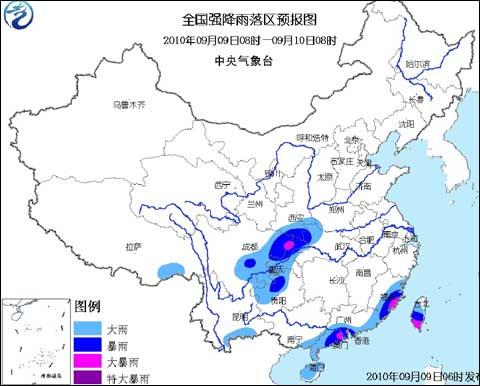中央氣象臺2010年9月9日06時繼續(xù)發(fā)布暴雨藍色預警: