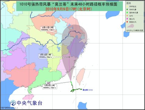 受熱帶風(fēng)暴和西南季風(fēng)共同影響,9月9日20時(shí)到10日20時(shí),巴士海峽、巴林塘海峽、臺(tái)灣海峽、南海北部、臺(tái)灣西部和南部沿海、福建中南部沿海、廣東沿海將有7-8級(jí)大風(fēng),“莫蘭蒂”中心經(jīng)過(guò)的附近海面或地區(qū)的風(fēng)力有9-11級(jí),陣風(fēng)可達(dá)12-13級(jí);浙江東部沿海和南部、福建、廣東中東部和西南部、廣西南部、海南、臺(tái)灣等地有大雨或暴雨,其中,福建東南部、臺(tái)灣南部等地局部有大暴雨。
