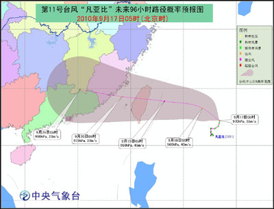 預(yù)計,“凡亞比”中心將以每小時10公里左右的速度向西偏北方向移動,逐漸向中國臺灣東部一帶沿海靠近,強度繼續(xù)加強,將于19日白天在這一帶沿海登陸。