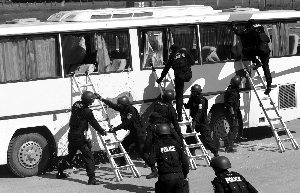 一輛旅游大巴車(chē)被“歹徒”“劫持”,一輛警用裝甲車(chē)突然頂住客車(chē)的車(chē)頭,迫使客車(chē)停止行駛。特警三人一組,破窗進(jìn)入客車(chē),幾秒鐘后,數(shù)名“歹徒”先后被控制住。昨日,北京公安特警和武警首次舉行反恐處突綜合實(shí)戰(zhàn)演練,向中外媒體、在京駐華使館安全官和警務(wù)聯(lián)絡(luò)官展示北京警方反恐能力。