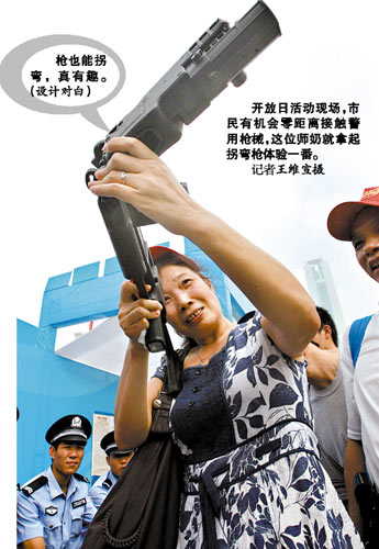 活動吸引了許多男女老少慕名前來觀看,男孩子對各種各樣的新式武器特別感興趣,都想親自摸一摸試一試,女孩子則對扮相很酷的男特警、女特警很癡迷,紛紛掏出相機和手機拍照。