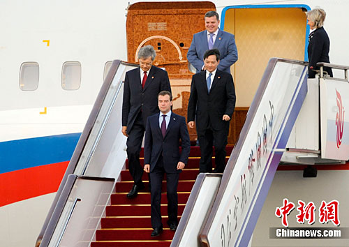 下午6時許,梅德韋杰夫乘坐的專機降落在北京首都國際機場。梅德韋杰夫步下舷梯,與前來迎接的中國外交部長楊潔篪握手寒暄。