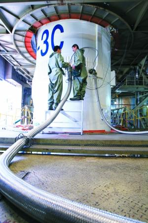 昨日,在西昌衛(wèi)星發(fā)射中心,工作人員對運載火箭加注燃料,“嫦娥二號”發(fā)射進入倒計時。張雷 攝