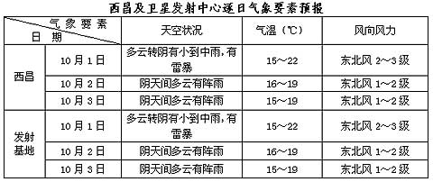 中國西昌衛(wèi)星發(fā)射中心的權(quán)威發(fā)布:“嫦娥二號(hào)”衛(wèi)星今天(10月1日)晚上即將迎來第一個(gè)發(fā)射窗口。預(yù)計(jì)今天空間天氣平靜,對(duì)嫦娥二號(hào)發(fā)射過程無不利影響;今天到4日,西昌市及衛(wèi)星發(fā)射基地以陰天或陰天間多云天氣為主,多陣性降水。