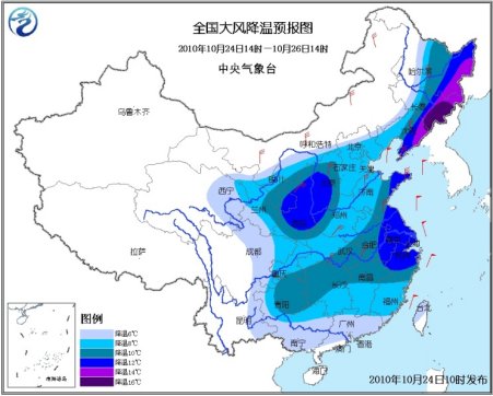 預(yù)計,10月24日14時至26日14時,西北地區(qū)中東部、內(nèi)蒙古南部、東北、華北、黃淮、江淮、江漢、江南、華南大部、西南地區(qū)中東部等地將出現(xiàn)6~12℃降溫,其中,黑龍江東南部、吉林東部、遼寧東部等地的部分地區(qū)降溫幅度可達14~16℃;上述北方大部地區(qū)伴有5~7級,南方有4~6級偏北風(fēng)。甘肅中部、青海中東部、寧夏、陜西北部等地將有雨夾雪或小到中雪,局地有大雪。