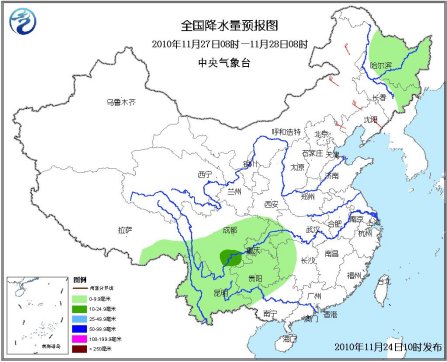 27日08時(shí)至28日08時(shí),東北地區(qū)北部有小到中雪;西南地區(qū)東部、江南西部、廣西西部等地有小到中雨。