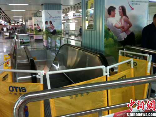 地鐵國貿站是雙站臺,發(fā)生事故的是第一層站臺通往站廳之間的一部OTIS扶手電梯。記者趕到現(xiàn)場時,傷員已經被送往醫(yī)院救治,出事電梯被警方封鎖。乘客需走旁邊的樓梯出站。