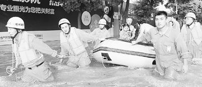 10月10日,來余姚支援的杭州消防支隊(duì)武警官兵在余姚市南西路幫助轉(zhuǎn)移被困群眾。