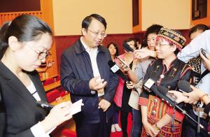 11月27日上午,全國人大常委會副秘書長沈春耀在?谛v十八屆三中全會精神。圖為他和五指山市黎族干部交流如何貫徹十八屆三中全會精神提高農(nóng)民收入。本報記者 王凱 攝