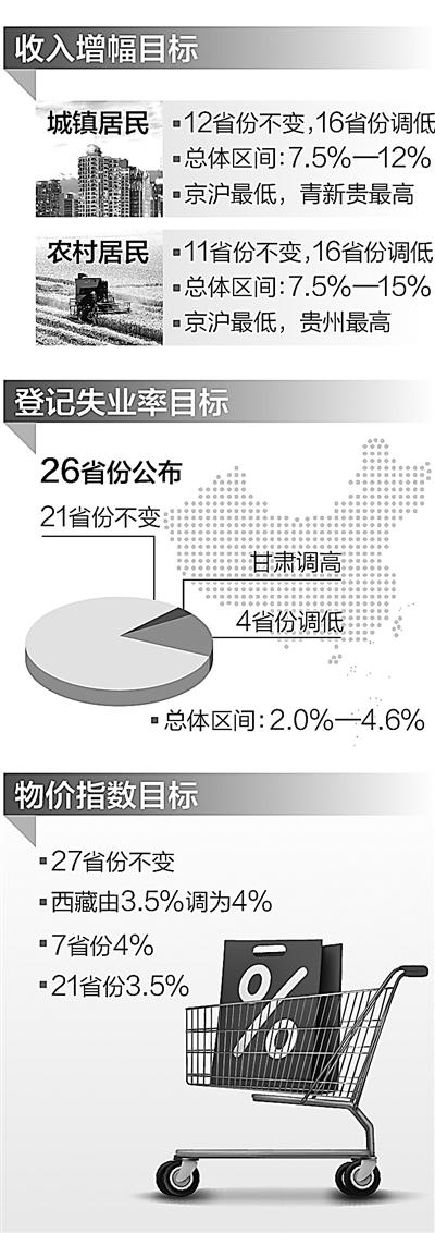 截至1月23日,除了安徽、海南、湖南,全國(guó)共有28個(gè)省份召開(kāi)兩會(huì)。梳理各地政府工作報(bào)告可以發(fā)現(xiàn),緊扣經(jīng)濟(jì)增長(zhǎng)目標(biāo),各地居民收入、物價(jià)指數(shù)、登記失業(yè)率等指標(biāo)也作了相應(yīng)調(diào)整。整體表現(xiàn)為:收入增幅目標(biāo)調(diào)低,物價(jià)調(diào)控目標(biāo)保持穩(wěn)定,登記失業(yè)率目標(biāo)變化不大。