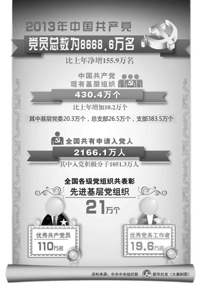 中央組織部最新黨內(nèi)統(tǒng)計(jì)數(shù)據(jù)顯示,截至2013年底,中國共產(chǎn)黨黨員總數(shù)為8668.6萬名,比上年凈增155.9萬名,增幅為1.8%;黨的基層組織總數(shù)達(dá)430.4萬個(gè),比上年增加10.2萬個(gè),增幅為2.4%。數(shù)據(jù)表明,中央關(guān)于黨員隊(duì)伍建設(shè)和基層黨組織建設(shè)的新部署新要求得到了較好落實(shí)。