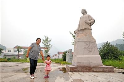 昨日,密云縣張家墳村,鄧玉芬的孫媳婦帶著孫女在鄧玉芬雕像前。新京報記者 王遠(yuǎn)征 攝