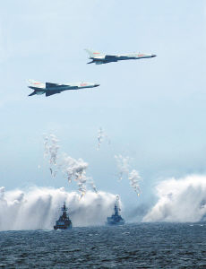 鎖定目標(biāo)!發(fā)射!茫茫大洋上,雙機(jī)編隊(duì)向“敵”機(jī)發(fā)起猛烈的鉗形攻擊。瞬間,兩架“敵”機(jī)凌空解體。
