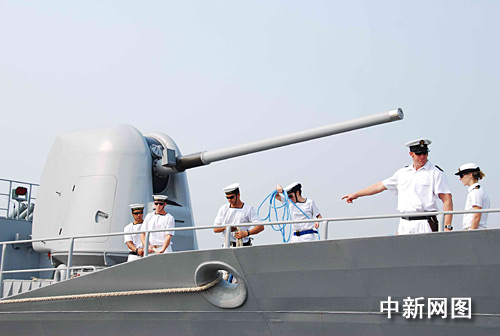 中國海軍在碼頭上舉行了熱情的歡迎儀式。軍樂隊高奏迎賓曲。數(shù)百名水兵列隊迎接,與新西蘭軍艦站坡官兵隔水相望,互至注目禮。兩名中國海軍女戰(zhàn)士向走下舷梯的大衛(wèi)•安森準(zhǔn)將和格蘭特艦長敬獻(xiàn)了鮮花。南海艦隊副參謀長么志樓將軍與大衛(wèi)•安森準(zhǔn)將握手,對新西蘭軍艦到訪南海艦隊表示歡迎。