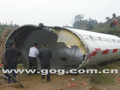 昨日,記者在主體殘骸墜落地現(xiàn)場看到:一個像中巴車般大小的圓柱體橫躺在已收割的包谷地里,由于殘骸墜落時巨大的沖擊力,圓柱體已略變橢圓,但仍較為完整,一個鐵架子的幾支腳已鉆進(jìn)了泥土里,還有一個像大塑料長管子的物件墜落在一姓吳的農(nóng)家房屋中堂,并將該堂屋擊壞。