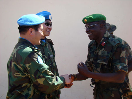 頭戴別有“地球和橄欖枝”徽章的藍(lán)色貝雷帽、身穿迷彩服、胳膊上佩戴著五星紅旗臂章的135名官兵精神抖擻地走下懸梯。等候多時(shí)的聯(lián)合國(guó)、非盟和蘇丹官員立刻上前迎接這批遠(yuǎn)道而來(lái)的中國(guó)客人,而一個(gè)多月前已先期抵達(dá)的5名中國(guó)維和工兵也到達(dá)現(xiàn)場(chǎng)和同事們回合。