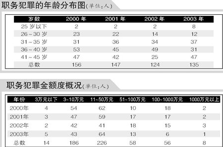 盧鐵峰說,目前,廣州青年職務犯罪人數(shù)的85%年齡在30歲~45歲,他們掌握了一定權力,有許多是單位和部門主管等。據(jù)不完全統(tǒng)計,2000年廣州青年職務犯罪中的單位領導(包括部門領導)為98人,2001年為99人,2002年為63人,2003年為71人,其中不乏處級、廳局級干部。
