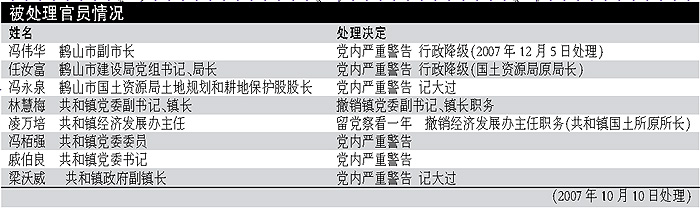 據(jù)監(jiān)察部、國土資源部12月11日發(fā)布的通報,鶴山市通過偽造虛假材料和化整為零的辦法,擅自調(diào)整規(guī)劃、違法補(bǔ)辦手續(xù),違規(guī)批準(zhǔn)該市共和鎮(zhèn)3626.8畝土地用于工業(yè)開發(fā),受到監(jiān)察部、國土資源部專案調(diào)查組的嚴(yán)厲批評。記者采訪了解到,江門市紀(jì)委、監(jiān)察局已經(jīng)對鶴山市副市長馮偉華給予嚴(yán)重黨內(nèi)警告、行政降級處分,給予國土局原局長任汝富黨內(nèi)嚴(yán)重警告、行政降級處分。
