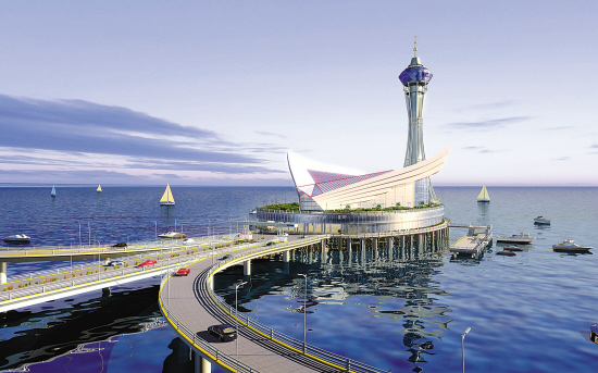 記者在海中平臺(tái)的效果圖上看到,這一平臺(tái)形似展翅的雄鷹,又如巨手托起的珍珠。該平臺(tái)位于杭州灣跨海大橋南航道橋以南約1.7公里下游150米處,距南岸約14公里。