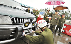 使用迷彩布遮蓋軍車號牌的行為將受到查處。昨日,廣州警備區(qū)協(xié)調陸、海、空軍、武警和公安,組織開展了打擊假冒軍車行動。廣東省軍區(qū)副參謀長閻學亭,廣州警備區(qū)司令員顏小明和參謀長張云山,來到現場進行指導。昨日早上在廣氮收費站的查車點,執(zhí)勤人員扣押了9輛冒牌軍車。