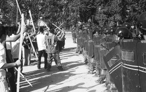 短時(shí)間內(nèi),由一百多名該分區(qū)人武部“處突”官兵、應(yīng)急分隊(duì)民兵組織“突擊分隊(duì)”全副武裝集合完畢。然后,他們分乘3輛大卡車快速向目標(biāo)地域開進(jìn)。