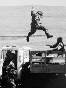 前方指揮部王部長立即下達(dá)捕殲命令。頓時(shí),一排排突擊炮彈朝著“恐怖分子”駕車沖來的公路傾瀉。直升機(jī)飛臨上空。第五作戰(zhàn)小組10多名戰(zhàn)斗隊(duì)員從直升機(jī)上躍下,直撲“恐怖分子”。