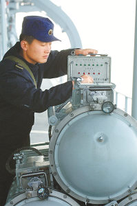 魚(yú)雷兵對(duì)魚(yú)雷進(jìn)行發(fā)射前檢查(王松岐/攝)