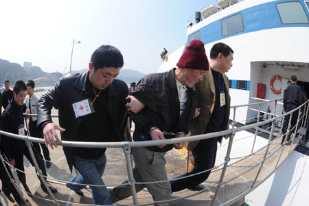 接下來的一切,是雙向遣返任務(wù)中的“常規(guī)動作”:確認(rèn)王志華身份無誤后,臺灣執(zhí)法人員把他移交給大陸有關(guān)人員。頭戴帽子、胡子花白的王志華卸下了臺灣的手銬腳鐐,換上了大陸的手銬,在一前一后兩個佩戴紅十字會證件的工作人員押帶下登上扶梯進入“海峽”號。