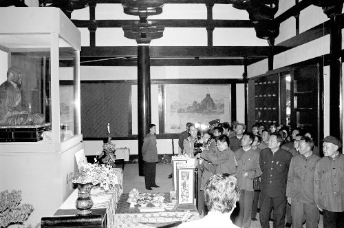 建于公元1688年的御影堂內(nèi),供奉著鑒真乾漆夾造的坐像,高2尺7寸,面向西方,雙手拱合,結(jié)跏跌坐,團目含笑,兩唇緊斂,表現(xiàn)鑒真于公元763年圓寂時的姿態(tài),已被定為日本國寶,每年只開放3天供人瞻仰。日本著名畫家東山魁夷為御影堂繪制的68幅屏障壁畫,有《云影》、《濤聲》、《黃山曉云》、《揚州薰風(fēng)》、《桂林月宵》和《瑞光》等。