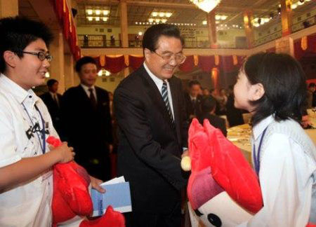2007年6月19日,胡錦濤主席在北京人民大會(huì)堂出席“中日青年世代友好聯(lián)誼晚會(huì)”時(shí),日本訪問團(tuán)中年齡最小的成員橫堀由、大木博來到胡錦濤面前,請(qǐng)胡主席為他們簽名。胡錦濤高興地對(duì)他們說,從你們身上,我看到了中日友好事業(yè)的希望。他將兩個(gè)北京奧運(yùn)會(huì)的吉祥物“福娃”贈(zèng)送給他們。兩位日本少年臉上露出喜悅的笑容。