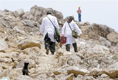 昨日下午2時許,本報記者一行人經(jīng)過3個小時徒步行軍,抵達(dá)一個叫山邊坪的地方,這里是成都軍區(qū)空軍的臨時駐地,距離銀廠溝溝口不足四公里。一個幾乎被地震摧毀的農(nóng)家樂旁,部隊?wèi)?zhàn)士正在埋鍋做飯,一些戰(zhàn)士拖著疲憊的雙腿,扛著鐵鍬等工具往下撤退;一些戰(zhàn)士正在就地掩埋尸體。營地旁邊的臨時停機(jī)坪,直升機(jī)從溝下轟鳴著而來,不時降落此地。