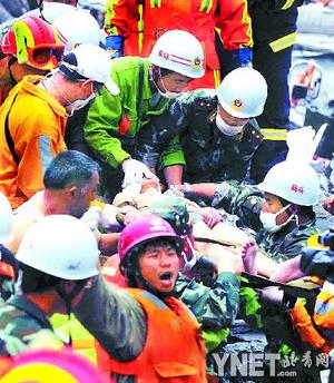 6點(diǎn)10分,手已經(jīng)伸了出來(lái),肩膀還卡著。消防隊(duì)員找了一塊門(mén)板,做好了最后的準(zhǔn)備。由于是五層樓坍塌,層層疊加在上面,都是水泥板,后面有木板,只能掏一個(gè)洞慢慢掏進(jìn)去。但是到下午,卞剛芬生命體征開(kāi)始變得衰弱,消防人員用一根管子,不斷給她喂水和牛奶,并不時(shí)和她聊天給她鼓勵(lì)。下午6點(diǎn)15分,在一片歡呼聲中,卞剛芬被成功救出,F(xiàn)場(chǎng)的醫(yī)療人員迅速對(duì)其進(jìn)行身體特征的檢查并對(duì)其輸液。現(xiàn)場(chǎng)響起一片掌聲。(馬輝 周春林)