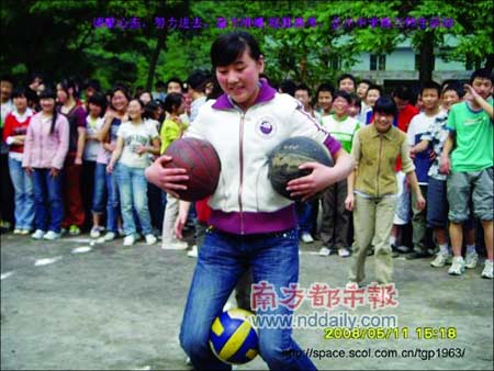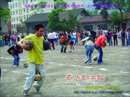 博客照片里在操場上歡笑的學生們,都是高三的孩子。地震前一天,高三年級搞了一個類似趣味運動會的活動。唐老師說,高三的學生很久沒有這樣歡暢地玩過了,他們一直在為迎接高考而奮戰(zhàn)。那天距離高考只剩下了26天。北川中學是綿陽市的示范學校,每年的高考成績是北川的驕傲。