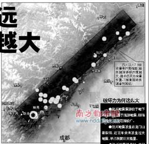 但是,地震對(duì)于地面的損害,主要由烈度決定。觀測(cè)汶川地震等烈度線時(shí),我們可以發(fā)現(xiàn),等烈度線大體上呈現(xiàn)為沿45度角向東北方向分布。這一方面是由于青藏高原隆起板塊向東移動(dòng),與成都平原陸地板塊產(chǎn)生了相對(duì)位移的應(yīng)力,而龍門山斷裂帶正好呈西南-東北走向;另一方面也說(shuō)明,相對(duì)于陸地板塊來(lái)說(shuō),龍門山斷裂帶是非常脆弱的。因此,地震的能量從震中汶川爆發(fā)出來(lái),沿著脆弱的龍門山斷裂帶向東北方向延伸,給這一帶地區(qū)帶來(lái)極大的震撼。有數(shù)據(jù)顯示,汶川地震發(fā)生時(shí),龍門山斷裂帶以每秒3公里的速度向東北方開(kāi)裂,從汶川到廣元用了整整100秒時(shí)間。這猶如墻上的裂縫,如果有擠壓或撕扯,通?偸茄刂延械牧芽p延伸傳遞能量。而北川、什邡、德陽(yáng)等重災(zāi)區(qū)恰恰位于龍門斷裂帶東北方,所以遭受重創(chuàng)也就在所難免了。