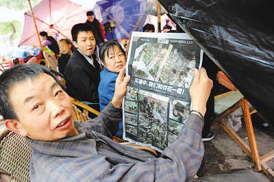 綿陽安縣人民公園安置點(diǎn),為災(zāi)區(qū)群眾提供了最新的報(bào)紙。(王科/攝)