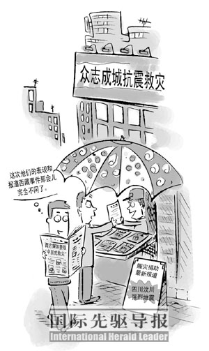 而此次中國(guó)政府所表現(xiàn)出來(lái)的開(kāi)放和透明度,讓西方媒體沒(méi)有了制造新聞的空間和機(jī)會(huì)。此次中國(guó)政府的救災(zāi)表現(xiàn),尤其是溫家寶總理的形象,確實(shí)“感動(dòng)了世界”,讓西方媒體感覺(jué)中國(guó)政府是一個(gè)真正為人民服務(wù)的責(zé)任政府。