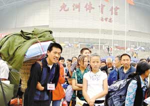 汶川大地震發(fā)生后,綿陽九洲體育館成了受災(zāi)群眾的臨時(shí)安置點(diǎn),數(shù)萬村民曾被轉(zhuǎn)移到這里。不過,昨天,記者在現(xiàn)場看到,幾十輛大巴正在將部分村民轉(zhuǎn)移出去,“我們是回家!北持罂、排著隊(duì)的村民說。