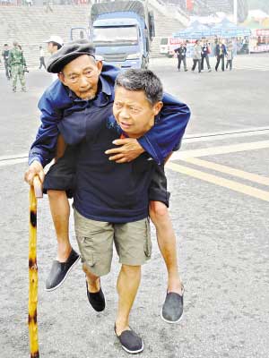 50歲的金光銀背著82歲的老父親金云才也來排隊(duì)。老人身體不好,腿腳不便,只有讓兒子背著走路。金光銀說:“政府都給我們安排好了,我們要轉(zhuǎn)移了!