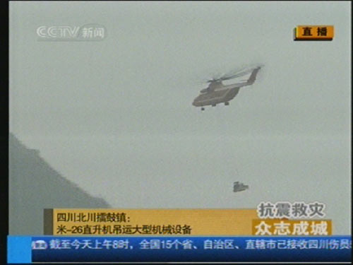 中新網(wǎng)綿陽5月26日電(霍潺)今天上午十一點(diǎn)零五分左右,一架紅色米-26直升機(jī)吊裝了一臺(tái)重約十三點(diǎn)二噸的重型挖掘機(jī)已起飛,前往唐家山堰塞湖壩體,大約二十多分鐘可以往返。