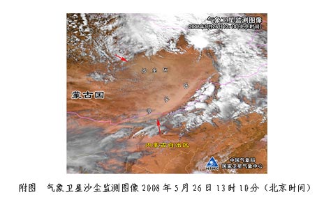 據(jù)監(jiān)測(cè),昨天(5月26日)下午至今天早晨,受蒙古氣旋和冷空氣的共同影響,內(nèi)蒙古中部和東部偏南地區(qū)出現(xiàn)了大范圍的揚(yáng)沙和沙塵暴天氣,其中,二連浩特能見(jiàn)度只有400米,蘇尼特左旗和那仁寶力格能見(jiàn)度同為600米,烏拉蓋、東烏珠穆沁旗、蘇尼特右旗、阿巴嘎旗和克什克騰旗能見(jiàn)度為700-800米。