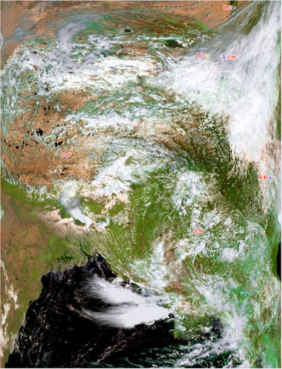 從北京、廣州、烏魯木齊、佳木斯4個氣象衛(wèi)星地面站接收到風(fēng)云三號A星第一軌可見光圖像中可以明顯看到,云圖右側(cè)的西北地區(qū)東部、西南地區(qū)東部以及青藏高原東北部受過境鋒面系統(tǒng)影響,被白亮的云系覆蓋;云系南側(cè),包括四川地震災(zāi)區(qū)在內(nèi)的盆地地區(qū)為層狀云覆蓋;云圖左側(cè)青藏高原其他地區(qū)上空云量較少,地表清楚,青海湖、哈拉湖、納木錯、色林錯等水體清晰可辨。