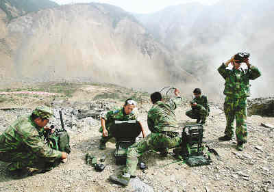 當(dāng)日16時(shí),擔(dān)負(fù)為直飛堰塞湖的飛機(jī)提供準(zhǔn)確氣象資料任務(wù)的成都軍區(qū)空軍氣象觀(guān)測(cè)小分隊(duì)向唐家山進(jìn)發(fā)。