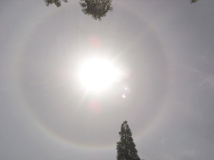 又訊 “不會又有事情發(fā)生吧?”、“不會,這是一個好兆頭!”昨日中午11時38分,記者到達(dá)青川縣城時,許多市民正仰天觀望,議論紛紛。有的市民稱,他們這輩子還是第一次見到這么大的日暈。記者抬頭發(fā)現(xiàn),在上空出現(xiàn)了一個巨大圓形,圍繞著太陽,最里面是一片灰色,外面依次是紅色、淺綠色和白色,這一現(xiàn)象持續(xù)了一個多小時才消失。