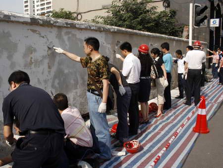 6月3日清晨的成都市繁華中心鹽市口國際商場圍墻邊,成都錦江區(qū)四大班子領(lǐng)導、機關(guān)干部、各街道辦黨政主要負責人在區(qū)委書記周思源和區(qū)長張濟環(huán)帶領(lǐng)下,正認真地粉刷著圍墻。四川新聞網(wǎng)記者獲悉,作為清潔城市大行動的一個部分,錦江區(qū)將根據(jù)創(chuàng)建成都市最清潔城區(qū)的目標,從即日起在全區(qū)范圍內(nèi)展開粉刷圍墻行動。