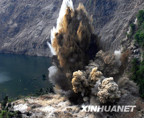 汶川地震發(fā)生后,青川縣青竹江石板溝一帶形成蓄水1200多萬(wàn)立方米水的堰塞湖,威脅著下游數(shù)萬(wàn)人安危,其中蓄水超過800萬(wàn)立方米的石板溝堰塞湖被水利專家定為高危湖。隨著雨季來(lái)臨,高70多米的堤壩隨時(shí)都可能出現(xiàn)險(xiǎn)情。為防止意外發(fā)生,武警水電三總隊(duì)對(duì)石板溝堰塞湖大壩實(shí)施了泄洪口爆破。