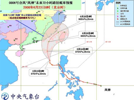 中新網(wǎng)6月23日電 據(jù)問天網(wǎng)消息,中央氣象臺(tái)今天上午十點(diǎn)鐘發(fā)布臺(tái)風(fēng)消息:今年第6號(hào)臺(tái)風(fēng)“風(fēng)神”(FENGSHEN)的中心昨天傍晚穿越菲律賓呂宋島進(jìn)入南海中部偏東海面。今天上午8時(shí)位于北緯17.1度、東經(jīng)117.7度,中心附近最大風(fēng)力仍有12級(jí)(33米/秒)。