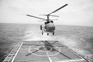 “丁零零!”戰(zhàn)斗警報(bào)響徹戰(zhàn)艦!啊痢梁^(qū)發(fā)現(xiàn)水下可疑目標(biāo),立即搜索!”一聲令下,艦載反潛直升機(jī)躍上藍(lán)天,在艦艇編隊(duì)前方偵測(cè)鎖定水下活動(dòng)目標(biāo)。
