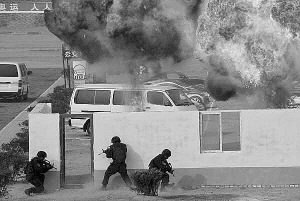 在指揮員下達(dá)攻擊令的余音聲中,突擊分隊(duì)兵分5路向目標(biāo)發(fā)起攻擊:從地下鉆出的特戰(zhàn)隊(duì)員,對大廳兩名歹徒實(shí)施了無聲射殺,迅速排除了出入口爆炸物,為救援行動(dòng)打開了通道?罩写菇档奶貞(zhàn)隊(duì)員從天窗潛入“歹徒”所在的樓層,乘坐攀登突擊車的兩組隊(duì)員左右破窗,與空中垂降的戰(zhàn)友同時(shí)攻入大廳,“歹徒”未及反抗,就被一一擊斃或制服。樓頂?shù)奶貞?zhàn)隊(duì)員在對防護(hù)窗實(shí)施精確爆破后,利用繩索從天而降,破窗而入,身體騰空中,舉槍擊發(fā),“歹徒”未及反應(yīng),就已中彈斃命,人質(zhì)被安全解救。