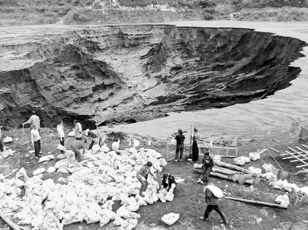用沙袋封堵塌陷口。